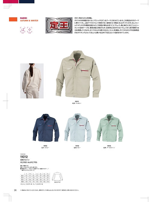 大川被服 DAIRIKI Kansai uniform,11012,長袖ブルゾンの写真は2024最新のオンラインカタログの26ページに掲載されています。 クリックして