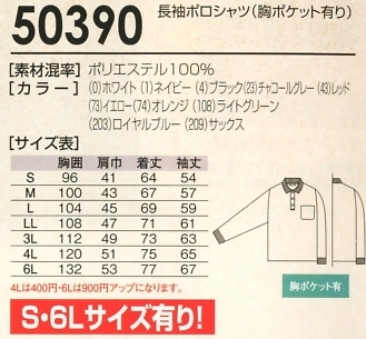 50390 長袖ポロシャツのサイズ画像