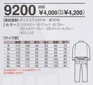 9200 続き服(ツナギ)のサイズ画像