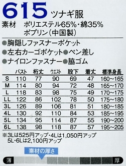 615 ツナギ服のサイズ画像