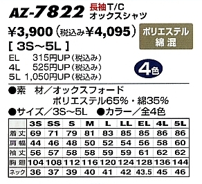 AZ7822 長袖T/CオックスBDシャツのサイズ画像
