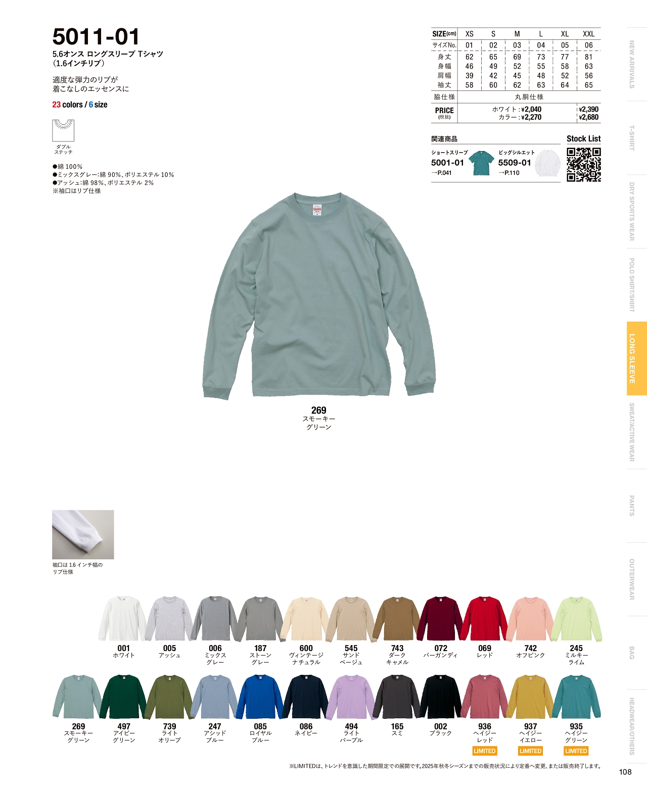 5.6オンスロングスリーブTシャツ 5011-01W