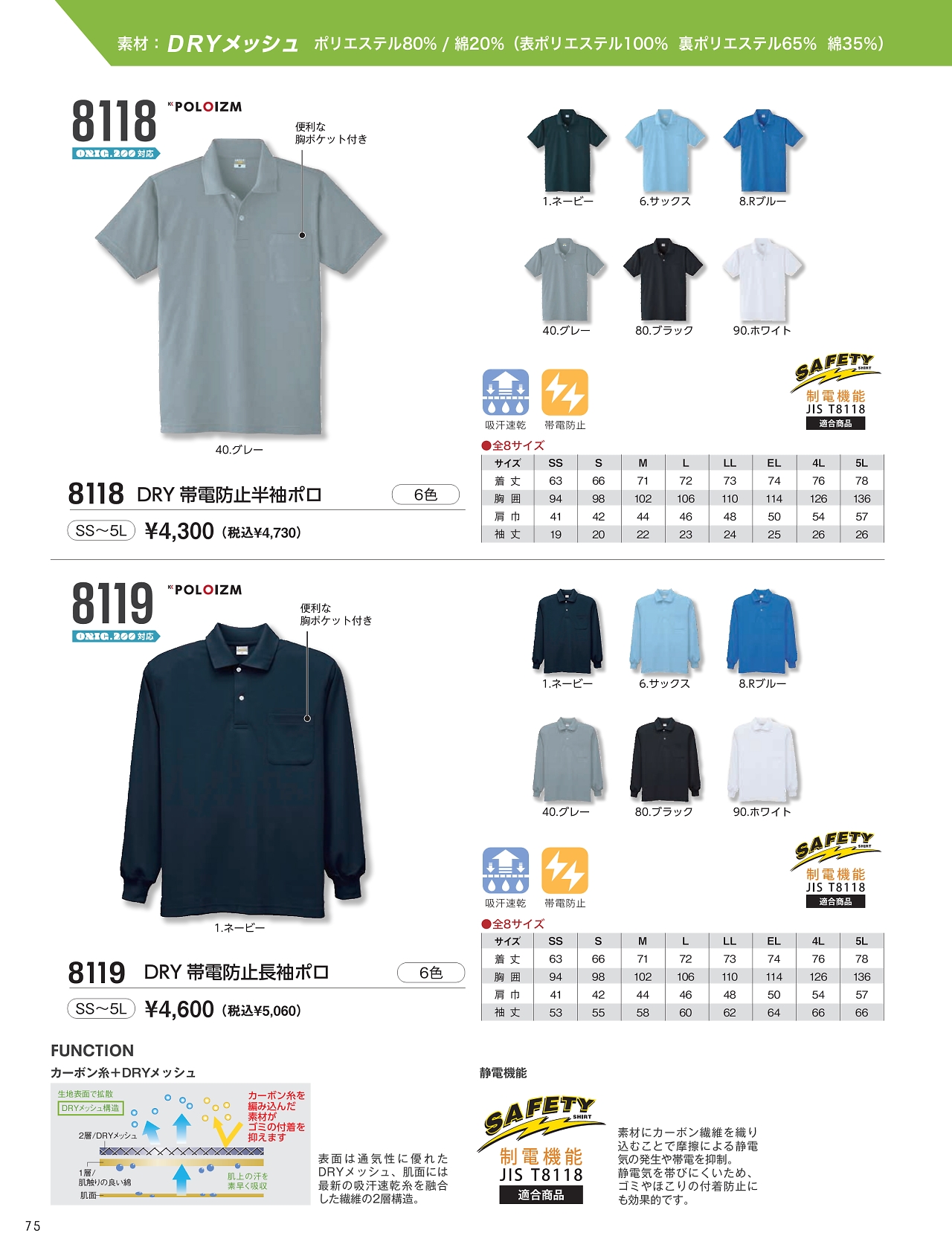DRY帯電防止半袖ポロシャツ 8118