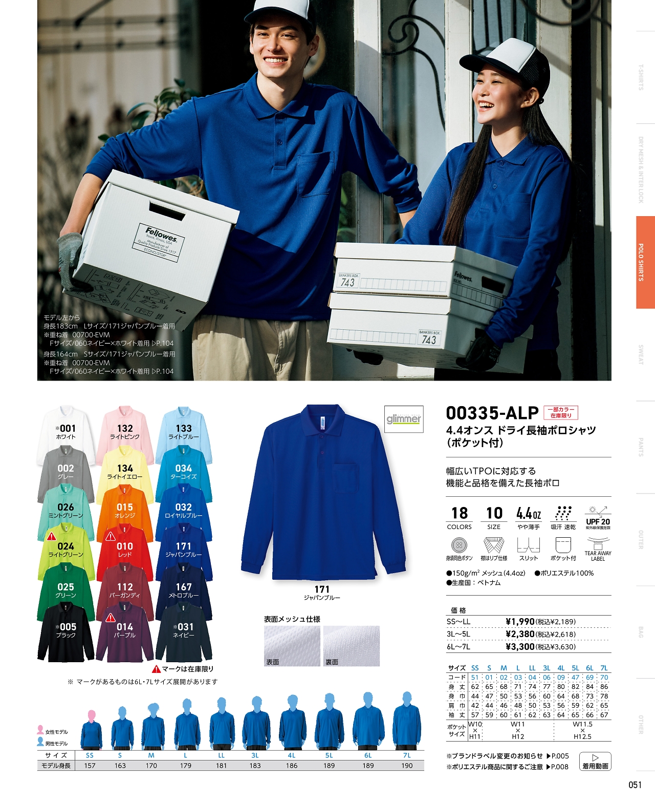 ドライ長袖ポロシャツポケ付 335ALP-3L-5L